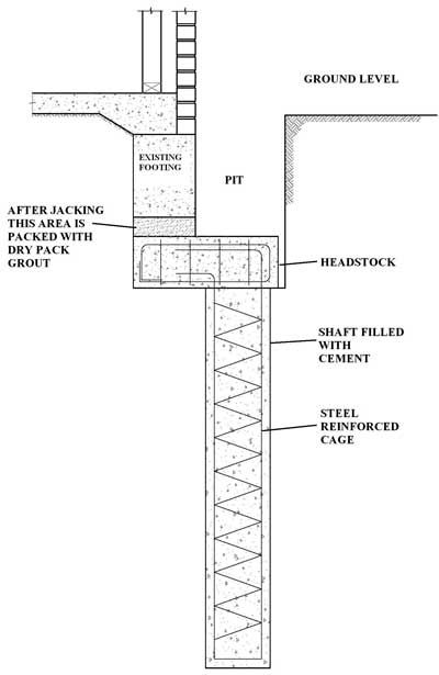 A steel reinforcing cage the depth of the pier is then placed down the pier with another cage known as a headstock joined from the top of the cage to underneath the existing footing. The pier is then filled with concrete which covers the headstock. A void is left between the top of the headstock and the bottom of the existing footing. This void is where a jack is placed for jacking to bring the walls of the building as close to original level as possible. Once the building is jacked the void is packed with dry pack grout and the pit is backfilled.