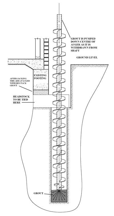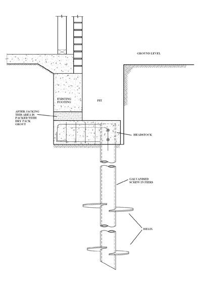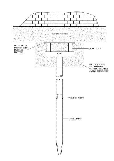 These piles can attain a depth of up to 15 metres. The centre of the steel pile is then filled with concrete and as with the bored piles, the top is then tied into the headstock. The headstock is then covered with concrete. A void is left between the top of the headstock and the bottom of the existing footing. This void is where a jack is placed for jacking to bring the walls of the building as close to original level as possible. Once the building is jacked the void is packed with dry pack grout and the pit is backfilled.